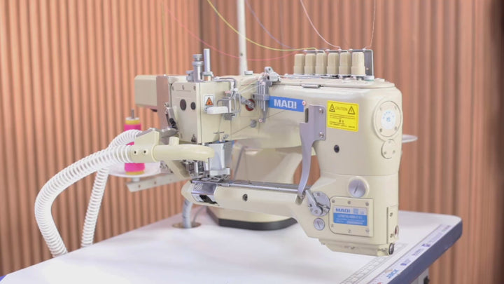 Máquina industrial flatseamer 6.0mm electrónica con motor incorporado dentro del cabezote de base cilíndrica de 4 agujas y 6 hilos, para cierre de todo tipo de prendas deportivas y prendas elásticas, incluye sistema sistema para succión de residuos, viene completa con mueble y accesorios, alimentación de energía a 220V y sistema de succión de residuos incluido.