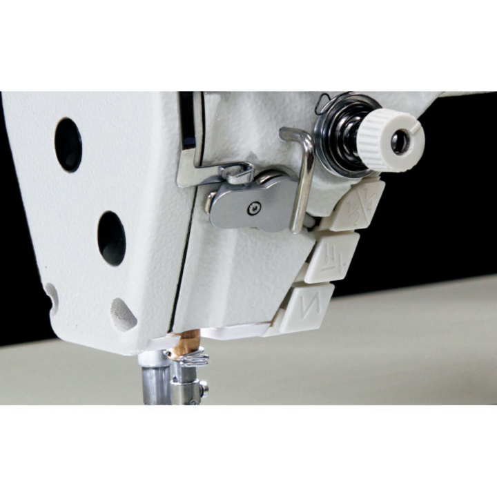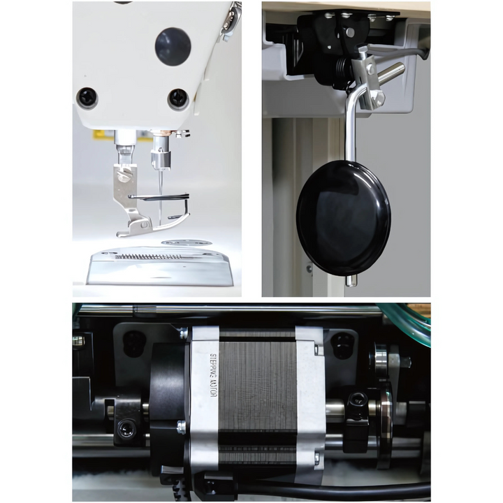 - Máquina de costura recta electrónica de una aguja con accionamiento directo, con cortahílos, sistema de alimentación eléctrica y levantamiento automático del pie.
