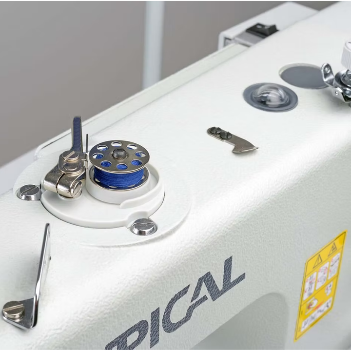 Máquina plana triple transporte mecánica GC0617D, su mecanismo triple transporte de diente, pie móvil y barra de aguja móvil es perfecto para coser materiales extra pesados, viene con motor servo ahorrador incorporado dentro del cabezote, mueble y accesorios.